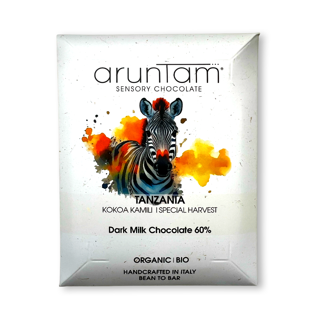 Od milánské čokoládovny Aruntam je i tato skvělá Dark milk čokoláda 60%. Tabulka je vyrobena z tanzánského kakaa a italského mléka. V krabičce na vás čeká čokoláda s krémovou konzistencí s tóny květin, ovoce a pražených ořechů.