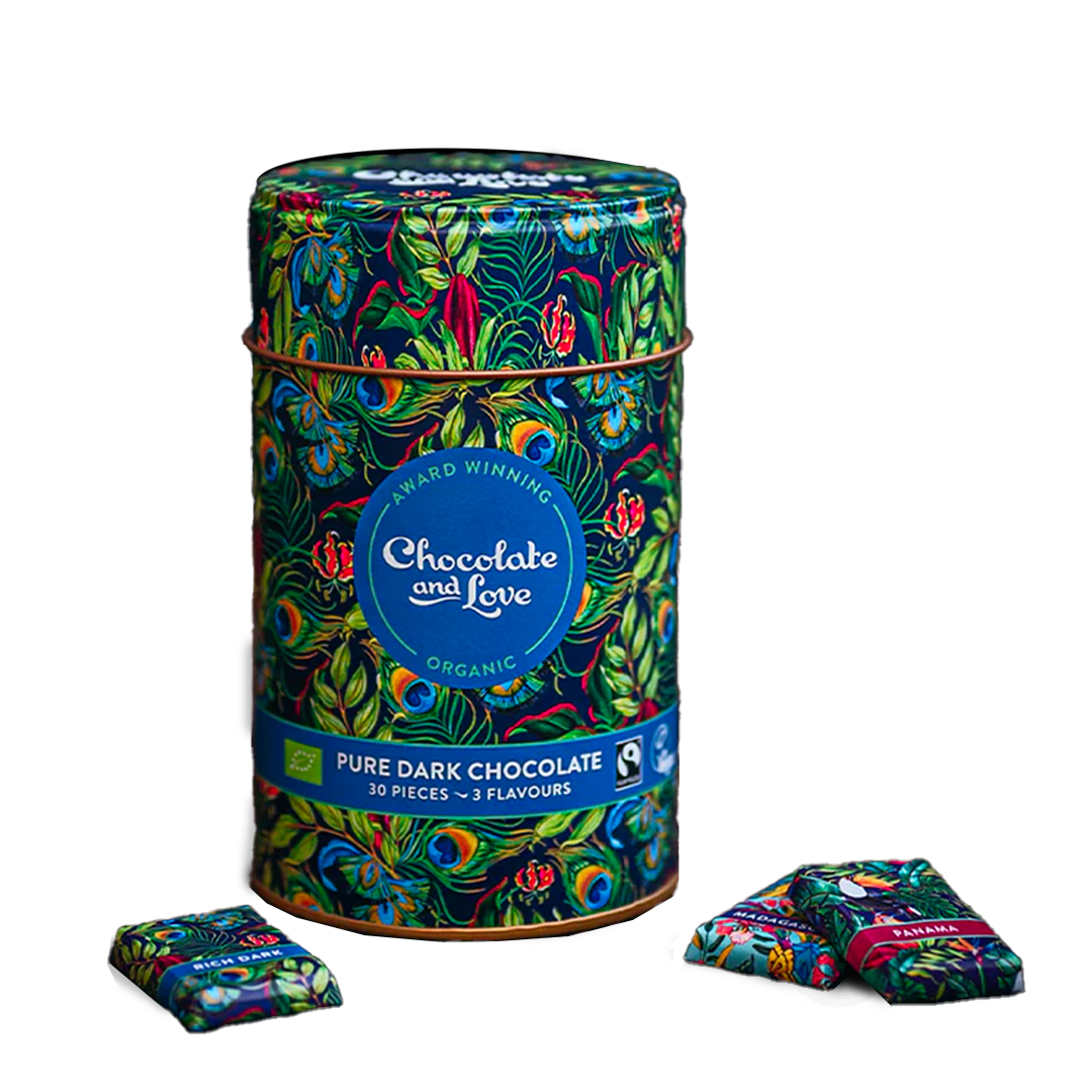 Krásná dárková plechovka plná napolitánek od Chocolate and Love. Po kapsách tak můžete nosit mini čokolády Rich Dark 71%, Panama 80% a hořkou novinku z Madagaskaru 70%. Čokoládky jsou baleny jednotlivě.