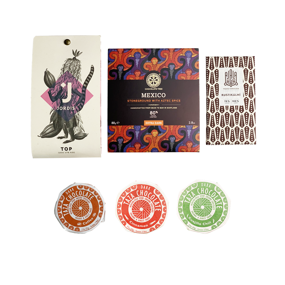 Přemýšleli jste někdy na tím, jak chutnala čokoláda kdysi, za dob starých Máyů a Aztéků? Máme pro vás sadu, která vás chuťově přenese právě do Střední Ameriky. Sada Rustikální vám nabídne tabulky, které jsou nahrubo mleté na kamenech a mají velmi výraznou strukturu. Tabulka od Chocolate Tree Aztec Spice v sobě skrývá navíc typické mexické koření, kde nesmí chybět chilli, takže má říz, krásně voní po skořici a muškátovém oříšku, Rustikální Ajala, která dostala i mezinárodní ocenění, Jordi's a jejich TOP, kde najdete drcených bobů víc než dost a samozřejmě nesmí chybět TAZA a tradiční Mexiko ve formě čokolády s chilli, kávou a skořicí.