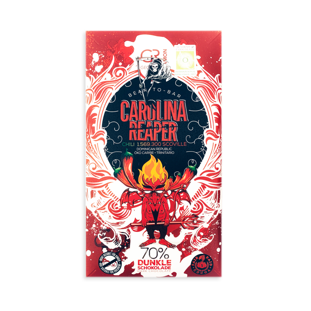 Že se do čokolády dá přimíchat skutečně cokoliv, dokazuje tato tabulka od Georgia Ramon. Známou chilli papričku Carolina Reaper v 70% čokoládě rozhodně ucítíte. Vlastně by se dalo říci, že ucítíte jen tu papričku, koneckonců je to nejpálivější odrůda na celém světě, která se zapsala i do Guinessovy knihy rekordů. Tato čokoláda je pro skutečně fajnšmekry a čokoládové masochisty. Chilli 1.569.300 scoville. My jsme vás varovali!
