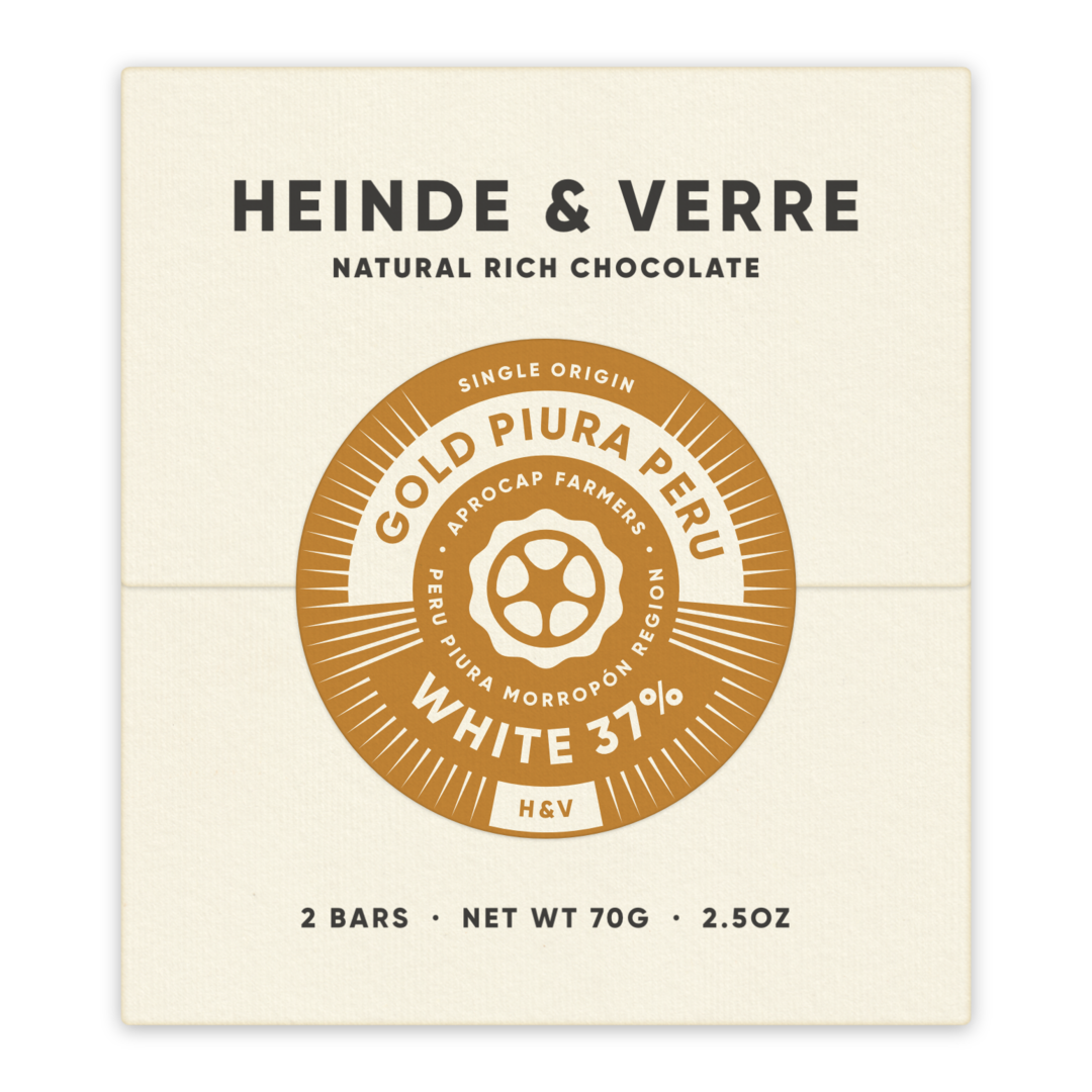 Heinde & Verre představují bílou čokoládu bez přidání jakýchkoliv jiných než přírodních aditiv. Přirozená chuť a aroma kakaového másla z Peru dodává čokoládě krémovou chuť a nepotřebuje extra přidání vanilky.