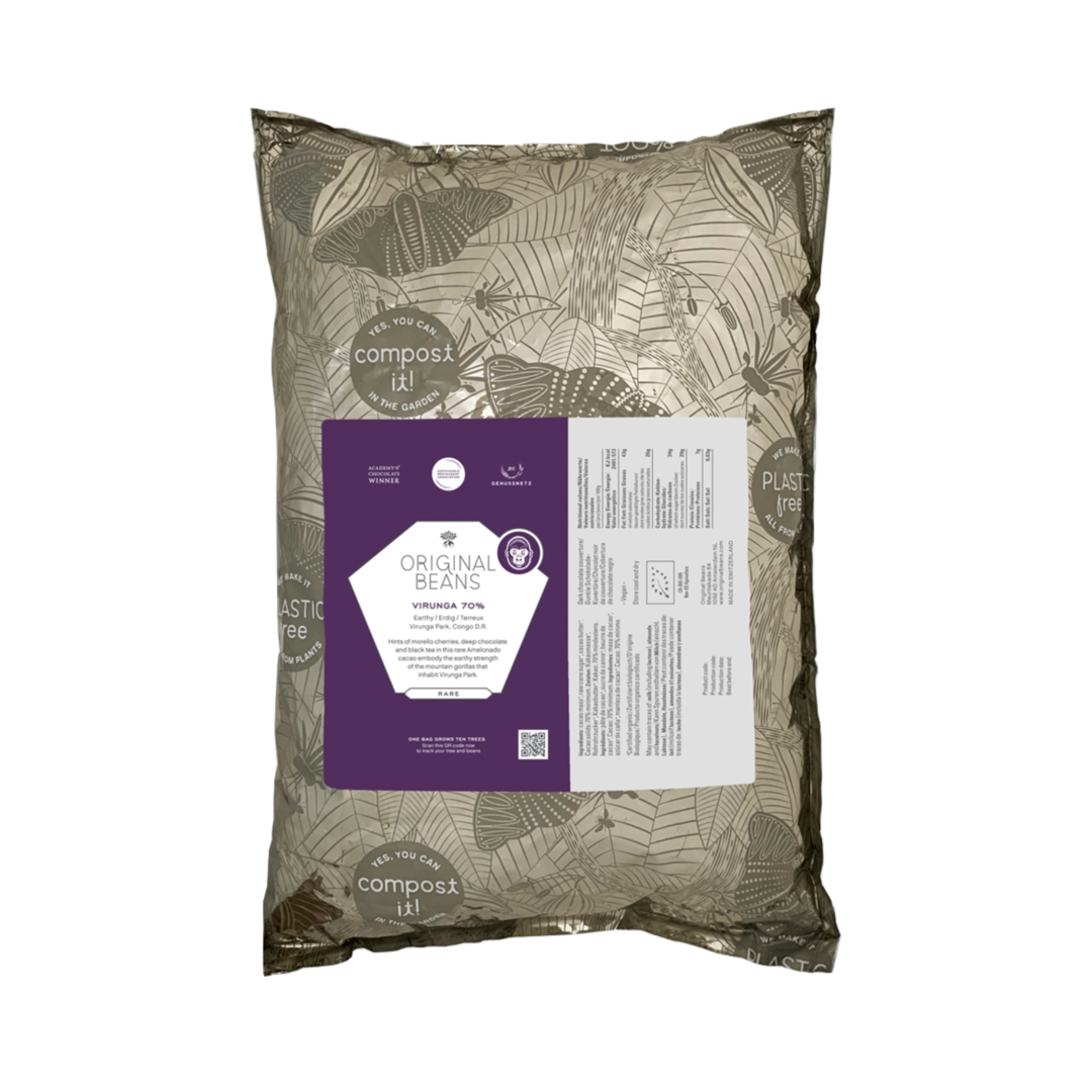 Oceněná čokoláda Cru Virunga 70%, Virunga Park, Kongo. Vynikající čokoláda nyní i ve formě čokoládových knoflíků má temně bordovou barvy, s tóny černého čaje a morello višní. Kakao používané k výrobě této tabulky, obejvili Original Beans v srdci národního parku ve východním Kongu - Virunga! V tomto národním parku žije v deštném pralese téměř 900 horských goril a tato čokoládovna přispívá na chod parku a podporuje místní zemědělce.