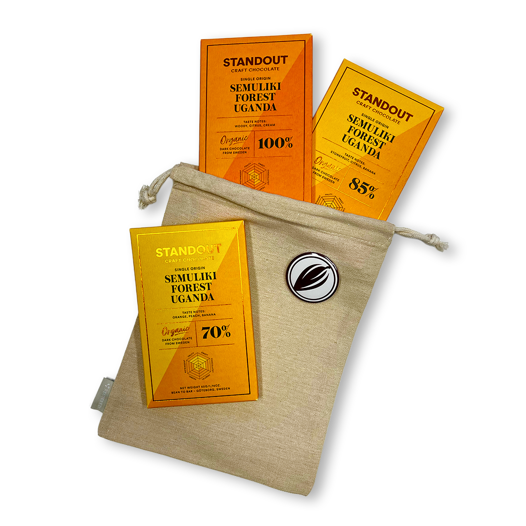 Zářivě žlutá sada od Standout, která vás chuťově seznámí s africkou Ugandou. Ochutnejte tabulky 70%, 85% a novou 100% čokoládu z jednoho druhu bobů a sami si vyzkoušejte, jak moc ovlivňuje přidaný cukr finální chuť tabulky. Čeká vás nezapomenutelný zážitek. Textilní pytlík je součástí balení.