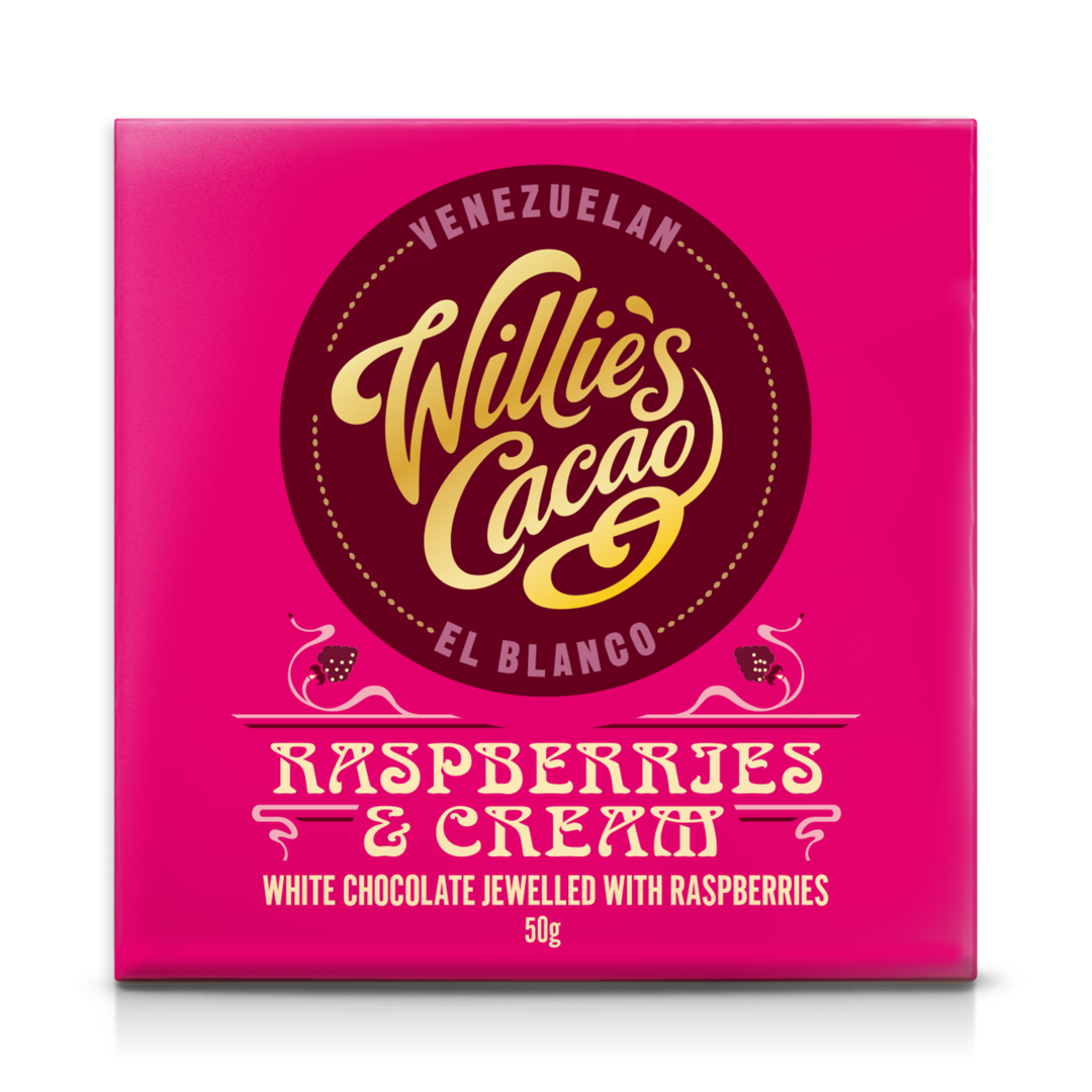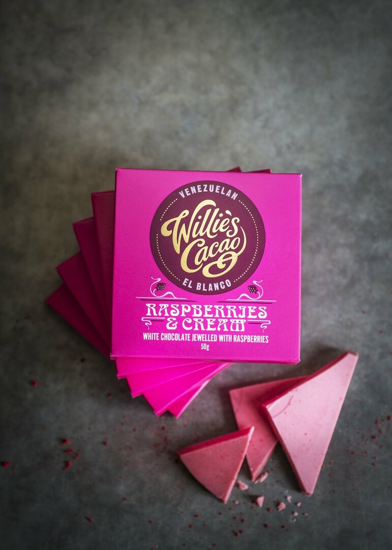 Bílá tabulka El Blanco s přidanými malinami je růžovým šperkem mezi čokoládami Willie's Cacao. Tabulka vyráběná v čokoládovně v Devonu, z čistého kakaového másla, třtinového cukru, mléka a malin. Perfektní kombinace!
