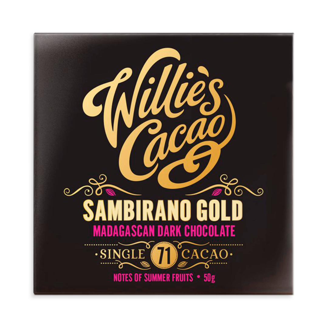 Hořká 71% čokoláda Sambirano Gold z Madagaskaru s tóny letního červeného ovoce Vás dostane. Těžko budete věřit tomu, že všechny chutě jsou čistě jen z kakaa a ochutnáváte "pouze" hořkou Single Origin tabulku bez příchutě. Kakao pochází z plantáží na břehu řeky Sambirano.